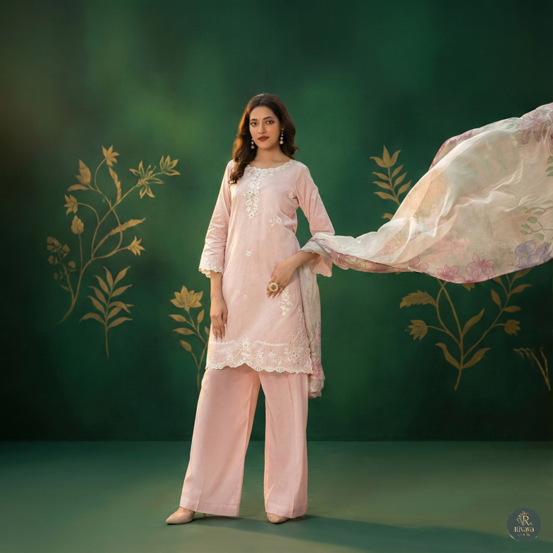 Delicate, graceful, and timelessly elegant, Tawakkali Layal D – 2132 is designed for those who appreciate soft sophistication. This ensemble is crafted in a soothing blush pink hue, beautifully enhanced with intricate white embroidery that adds a touch of classic charm.